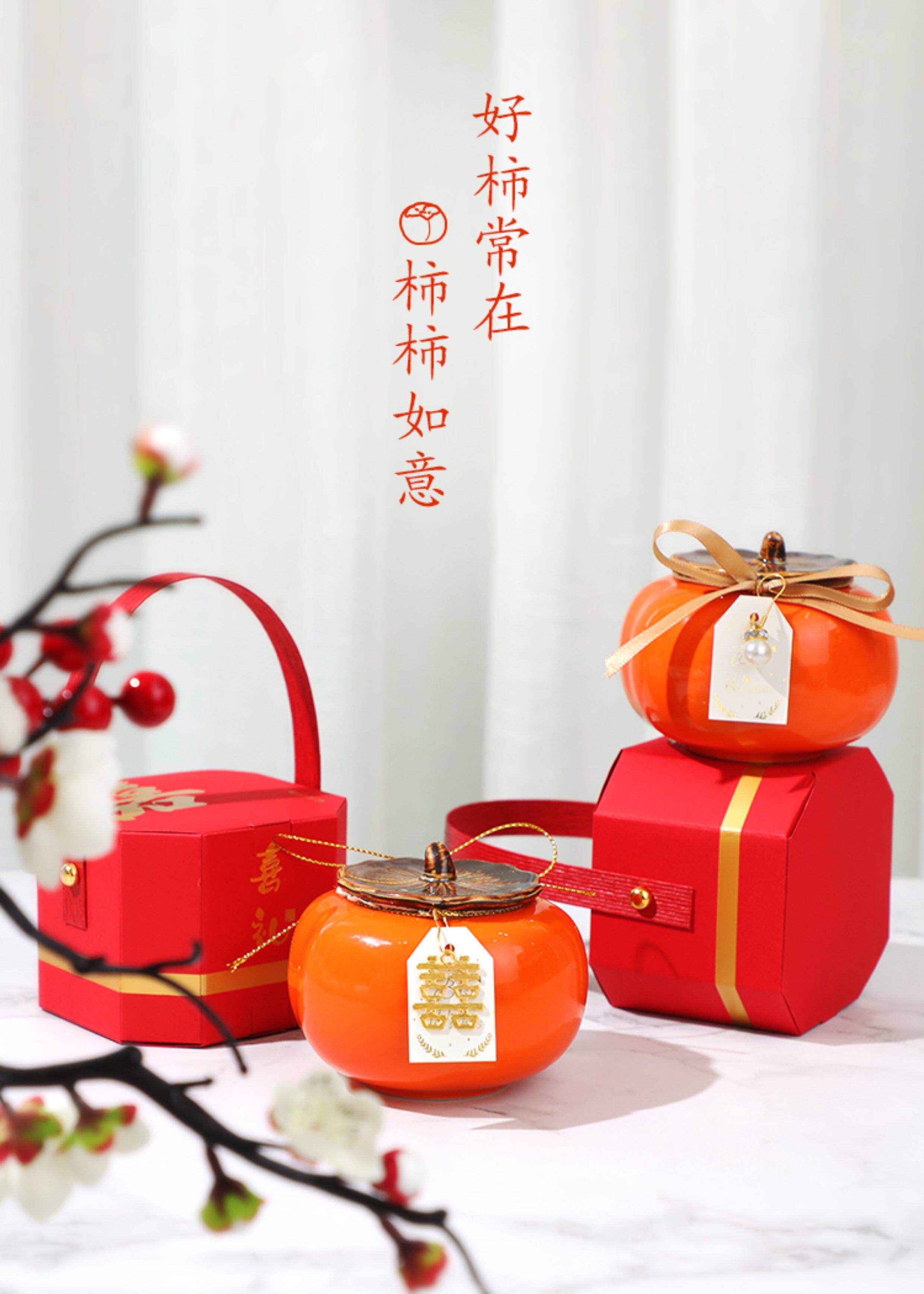 柿柿如意柿子罐摆件糖罐结婚喜糖盒子陶瓷订婚糖果